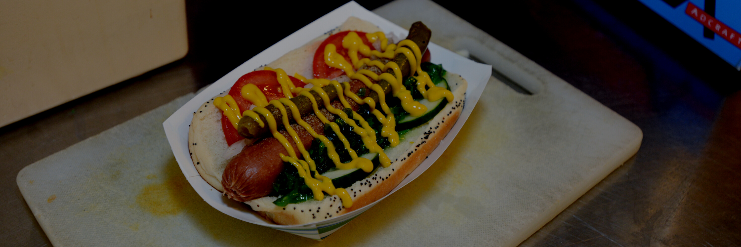 Hot Dog on a poppy seed bun, topped with yellow mustard, chopped onions, Vienna style pickle relish, tomato wedges, a pickle spear, cucumber wedge, peppers, and topped with celery salt.
